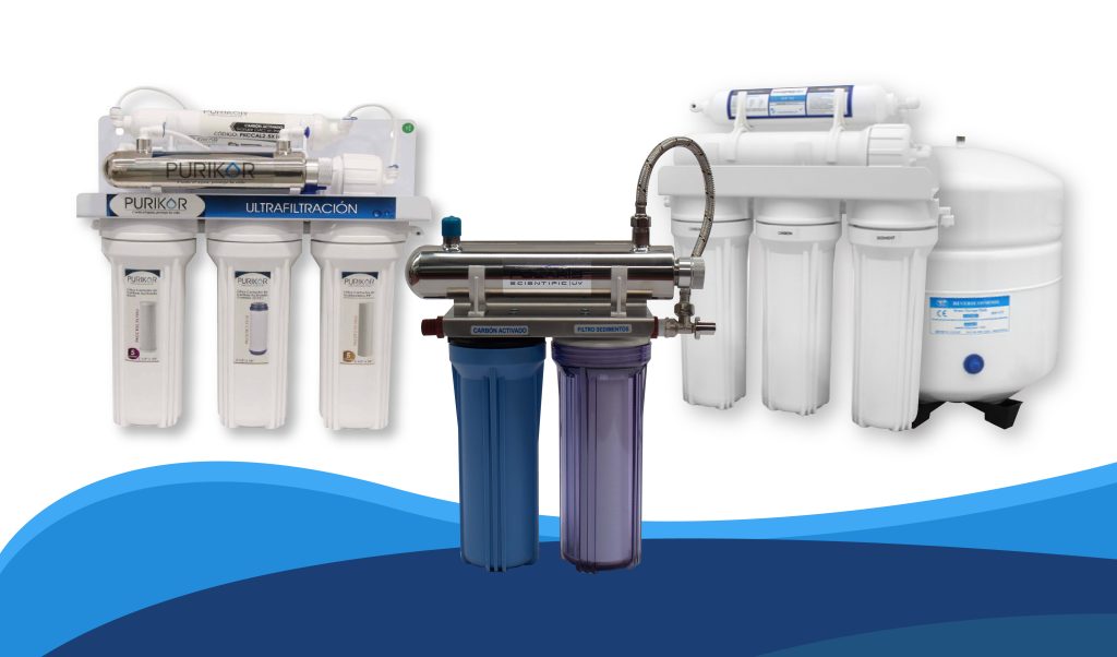Sistemas prácticos que se instalan directamente en el grifo o debajo del fregadero. Filtran sedimentos, cloro, olores y otros contaminantes para que puedas beber y cocinar con agua limpia y segura todos los días. Conoce nuestros equipos de Ósmosis inversa, Ultrafiltración y Ultravioleta.